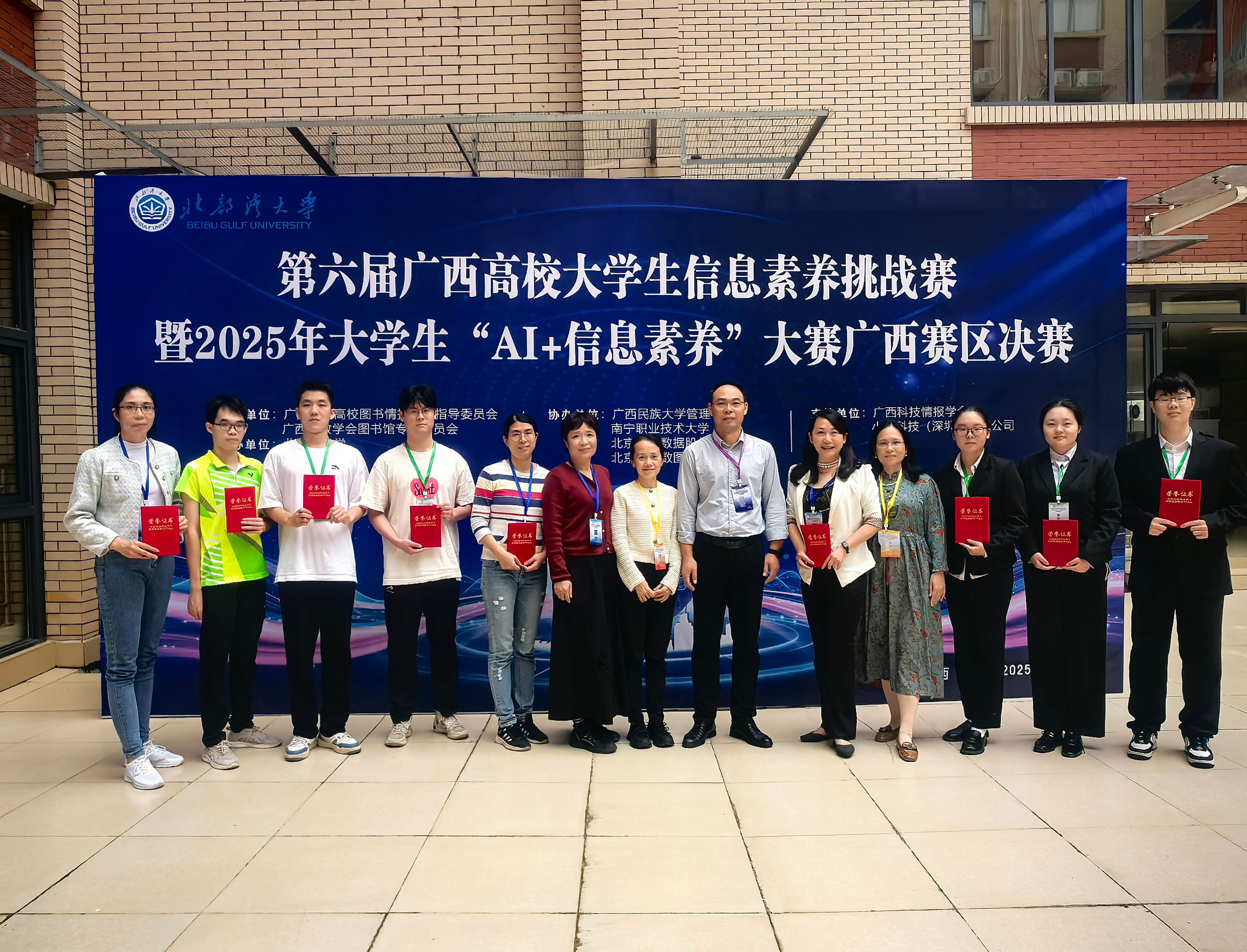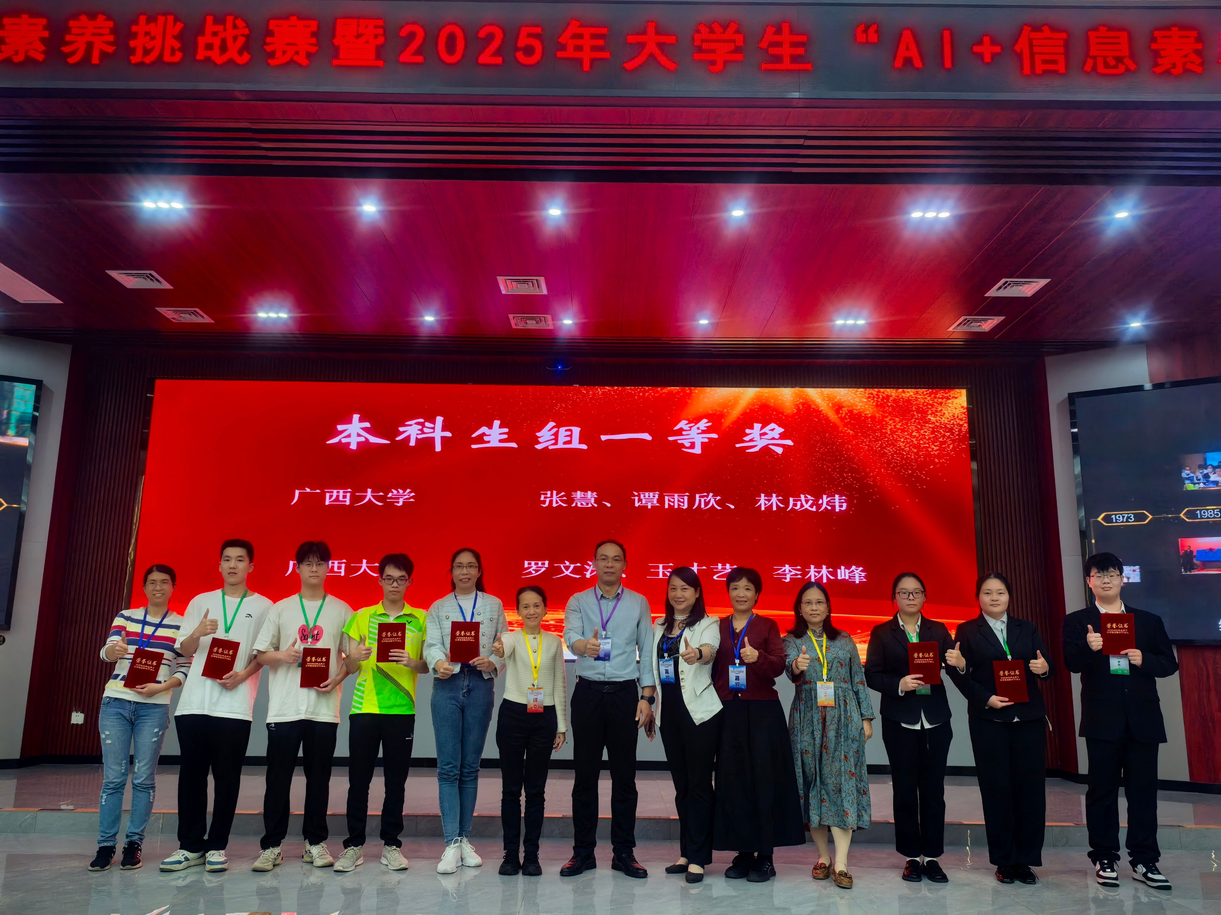 近日,第六届广西高校大学生信息素养挑战赛暨2025年大学生“AI+信息素养”大赛广西赛区决赛在北部湾大学落幕。我中心陈海华、樊利勤、黄以婉、郑羡等老师指导的两支参赛队伍凭借扎实的专业功底与出色的创新能力,在激烈角逐中脱颖而出,一举斩获第一、第二名,包揽广西赛区一等奖(最高奖项),并获得代表广西参加全国联赛的资格。